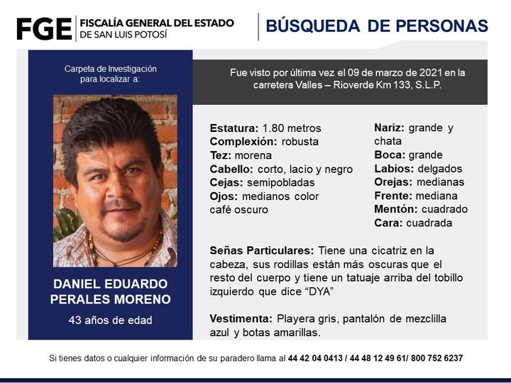 El conocido mecánico de la zona media, Daniel Eduardo Perales Moreno, se reportó como desaparecido el reciente martes 9 de marzo, afuera del taller de un familiar, que se ubica en la carretera a Valles, unas cuantas cuadras antes de llegar al Puente Verástegui.
