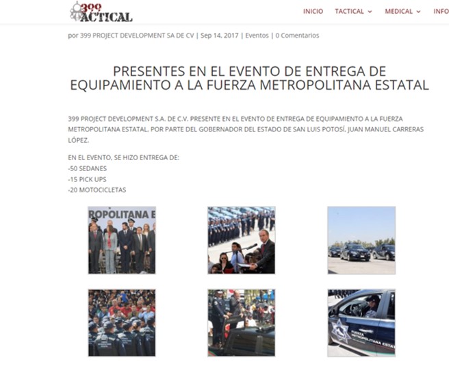 La empresa 399 Project Development expone haber prestado servicios en el sexenio anterior, con vehículos para Protección Civil y la Fuerza Metropolitana Estatal, donde entregó 50 vehículos tipo sedanes, 15 Pick Ups y 20 motocicletas en el 2017. Se desconoce el monto total erogado. En el 2018, se realizó otro contrato por 21 patrullas con un gasto de 16.7 millones de pesos.
