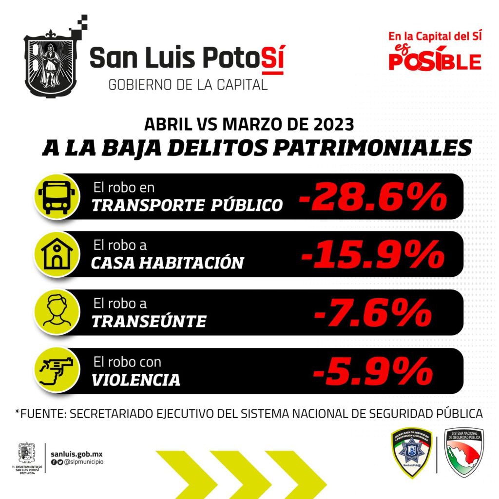 De acuerdo con la información, durante el mes de abril se observó una reducción del 8.7 por ciento en la incidencia delictiva total en el municipio de San Luis PotosÃ, gracias a una disminución del 28.6 por ciento en el robo en transporte público, una reducción del 15.9 por ciento en el robo a casa habitación, asà como un decremento del 7.6 por ciento en el robo a transeúnte y un 5.9 por ciento en el delito de robo con violencia, todos pertenecientes a los delitos del fuero común.