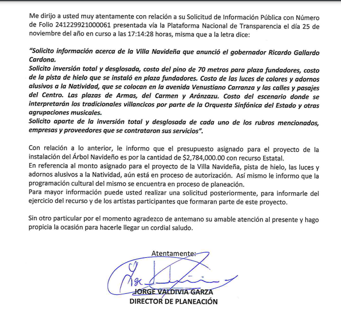 “Le informo que el presupuesto asignado para el proyecto de instalar el árbol navideño, es por la cantidad de 2 millones 784 mil pesos con recursos estatales. En referencia al monto asignado para el proyecto de la villa navideña, pista de hielo, luces y adornos alusivos, aún están en proceso de ser autorizadosâ€.