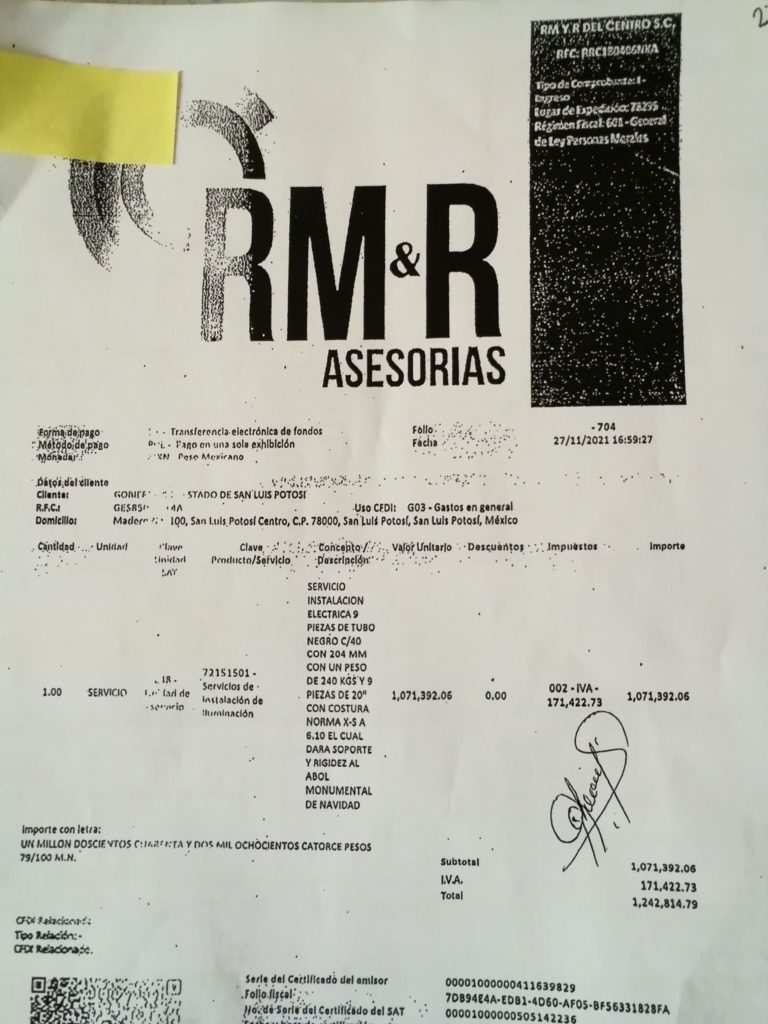 En otra reciente solicitud de informes, con folio 241229921000067, por parte de La Noticia, dirigida a la SecretarÃa de Cultura, se pidieron conocer más gastos del Festival de Invierno y posadas navideñas. La dependencia emitió una nueva factura por la cantidad de un millón 242 mil 814.9 pesos pagada a la firma RM y R AsesorÃas, por el concepto de servicio de instalaciones eléctricas y 9 piezas de tubo c/40 con 204 milÃmetros, con un peso de 240 kilogramos, 9 piezas de 20 pulgadas, con costura norma x-s a 6.10. Los insumos eran para dar soporte y rigidez al árbol monumental.